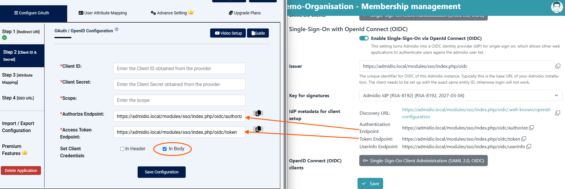 Basically, one (1) needs to create a cryptographic key to sign message and choose a unique EntityID. The page https://admidio.local/adm_program/modules/preferences.php?panel=sso also provides the link to the metadata xml, and the individual settings in case a client does not support auto-configuration via metadata.