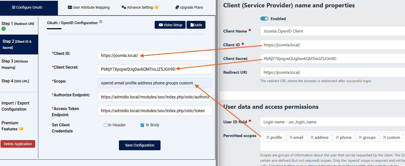 Setting up a client (OpenID “Relying Party” - short RP) to use Admidio's user accounts for logging in consists of two steps: (1) The client (RP, Joomla in our case) needs to be set up with the data about the OpenID Provider (OP). Typically this is done via the metadata provided in the discovery URL of the provider. Otherwise one has to manually paste the endpoint URLs of the OpenID provider. Since Admidio provides those URLs with copy buttons in the preferences screen, even the manual configuration is rather straigtforward. (2) Admidio needs to be told about the client. In particular, the entity ID and the redirect URL must be given, and a custom-generated (random) secret must be copied to the client configuration.