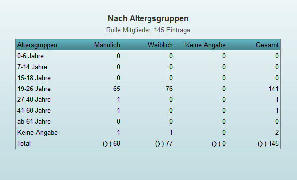 Mit diesem Plugin können frei konfigurierbare Statistiken über Profilfeldinhalte und Rollen erstellt werden. Dazu wird einmalig eine Statistik (ähnlich der eigenen Liste) konfiguriert und abgespeichert. Später kann diese vorkonfigurierte Statistik dann beliebig oft aufgerufen werden. Die aus einer Konfiguration erstellte Statistik, kann danach von berechtigten Mitgliedern eingesehen werden.