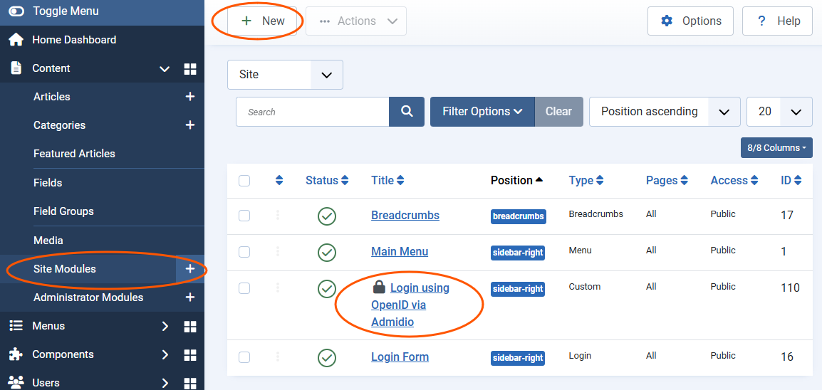 Starting with version 5.0, Admidio can be used by other applications to authenticate users against Admidio's user base. These instructions will guide you through the process of connecting Joomla to Admidio to use Admidio's login. For general instructions, and other apps, please visit the general Single-Sign-On overview page.