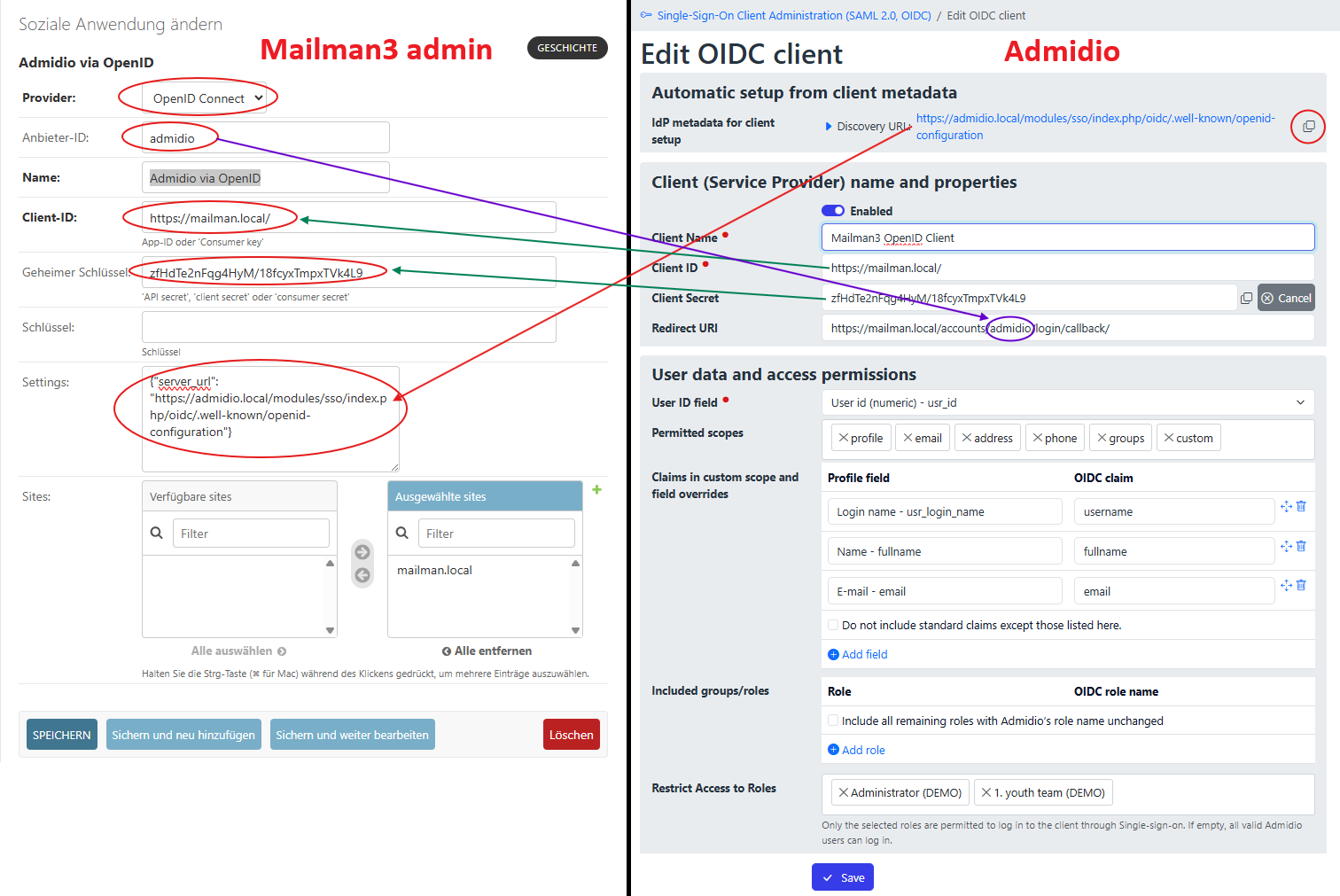- The “Client ID” and “Client Secret” in Admidio and Mailman3 have to match exactly. The ID is typically the client's URL, although some clients allow any unique identifier. The Client Secret should a random string and will serve like a password. Admidio will create one and allow it to be copied to the client. Afterwards it is only stored as a hash in the database and not be recovered any more. However, one can create a new Client Secret in Admidio and copy that to the client's configuration.