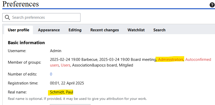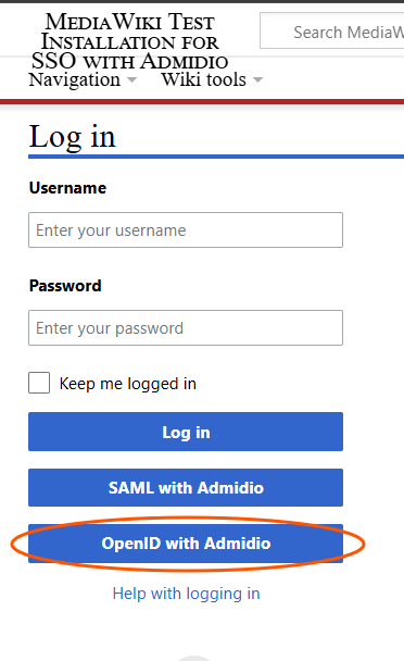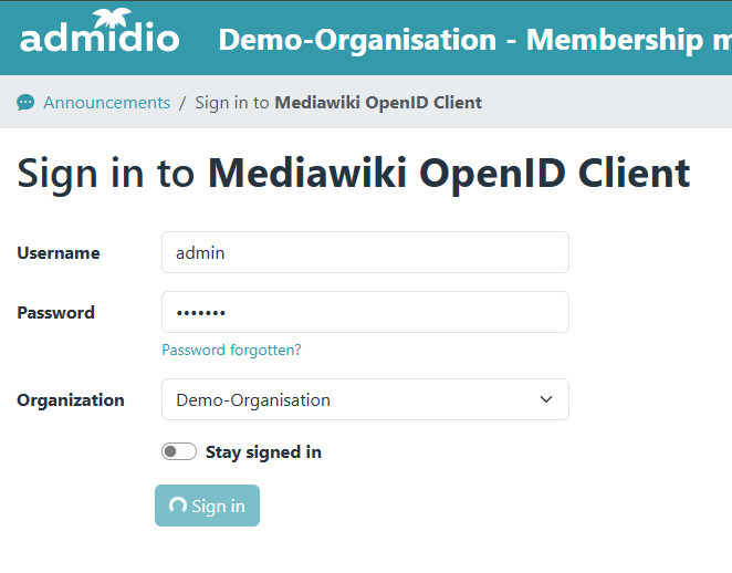 Admidio and MediaWiki should now be set up to use Admidio for logging in to MediaWiki. If you log out of MediaWiki (or open a new incognito browser window) and try to log in again, you will be shown the Admidio login screen and then redirected back to MediaWiki after successful login. If groups are properly set up and mapped, MediaWiki groups will also be assigned, even admin rights through the OIDC group 'sysop'.