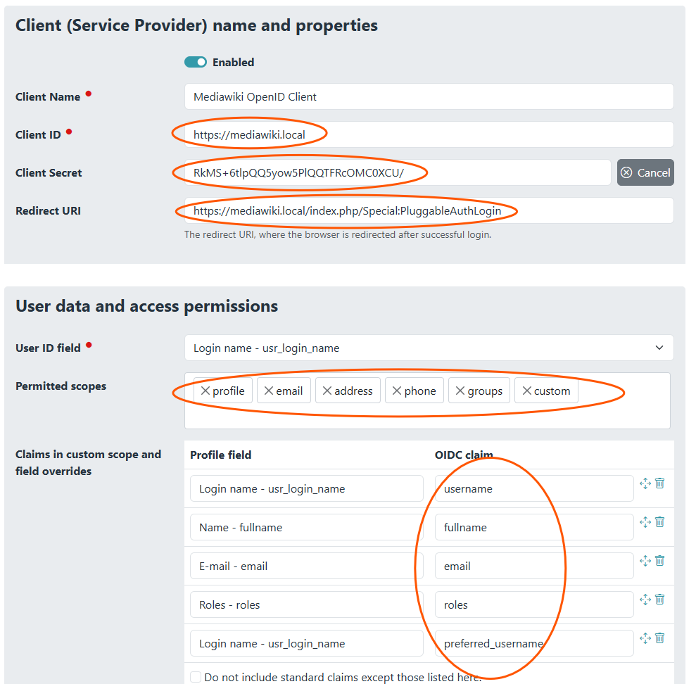 The clientID and the client secret in the Admidio client page and MediaWiki's LocalSettings.php have to match exactly. Similarly, the scopes should coincide, otherwise not all desired profile fields will be transmitted. To make use of the group mapping in MediaWiki, make sure to include the 'groups' scope in Admidio and Mediawiki, and map the 'Roles - roles' Profile Field to an OIDC claim.