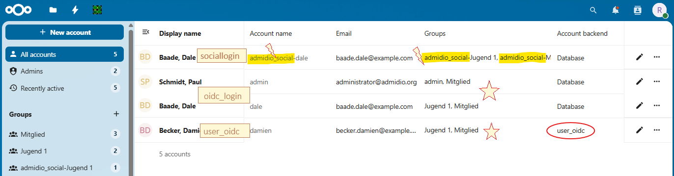 - The user_oidc plugin registers the user as belonging to the user_oidc backend, and properly assigns the groups from Admidio.