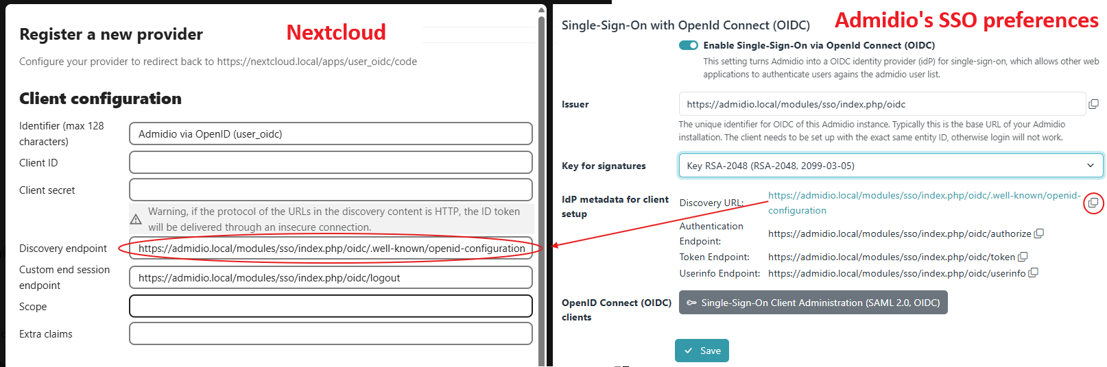 https://[YOUR_ADMIDIO]/modules/sso/index.php/oidc/.well-known/openid-configuration). It should be pasted into Nextcloud's OpenID Client configuration as “Discovery endpoint”. All other endpoints shown in Admidio's preferences screen are provided in the discovery document and don't need to be copied manually.