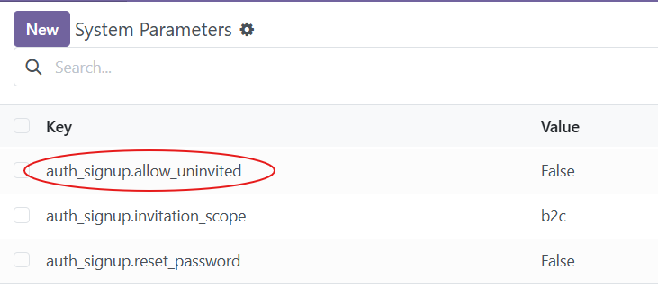 Odoo can automatically create a new user when a new account logs in using OpenID Connect through Admidio. This functionality is provided by the auth_signup plugin, which must be activated and configured. In developer mode, go to “Settings” → “Technical” → “Parameters” ⇒ “System Parameters”