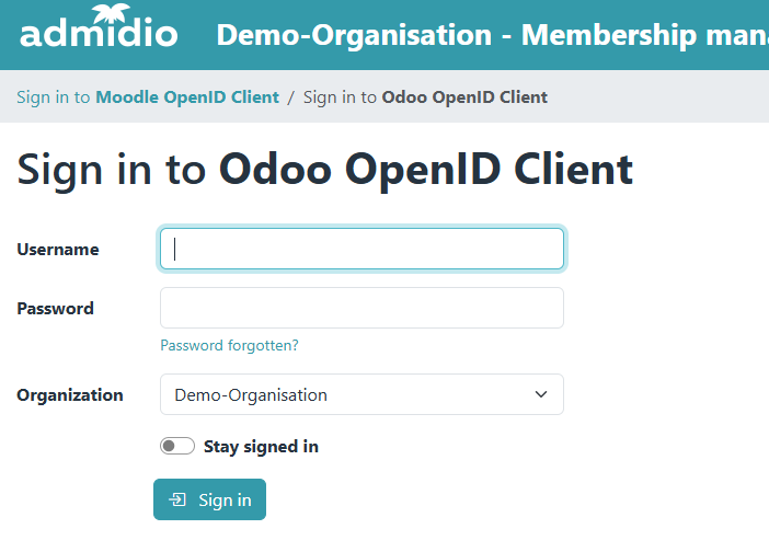After successful login to Admidio, the user will be redirected back to Odoo and logged in.