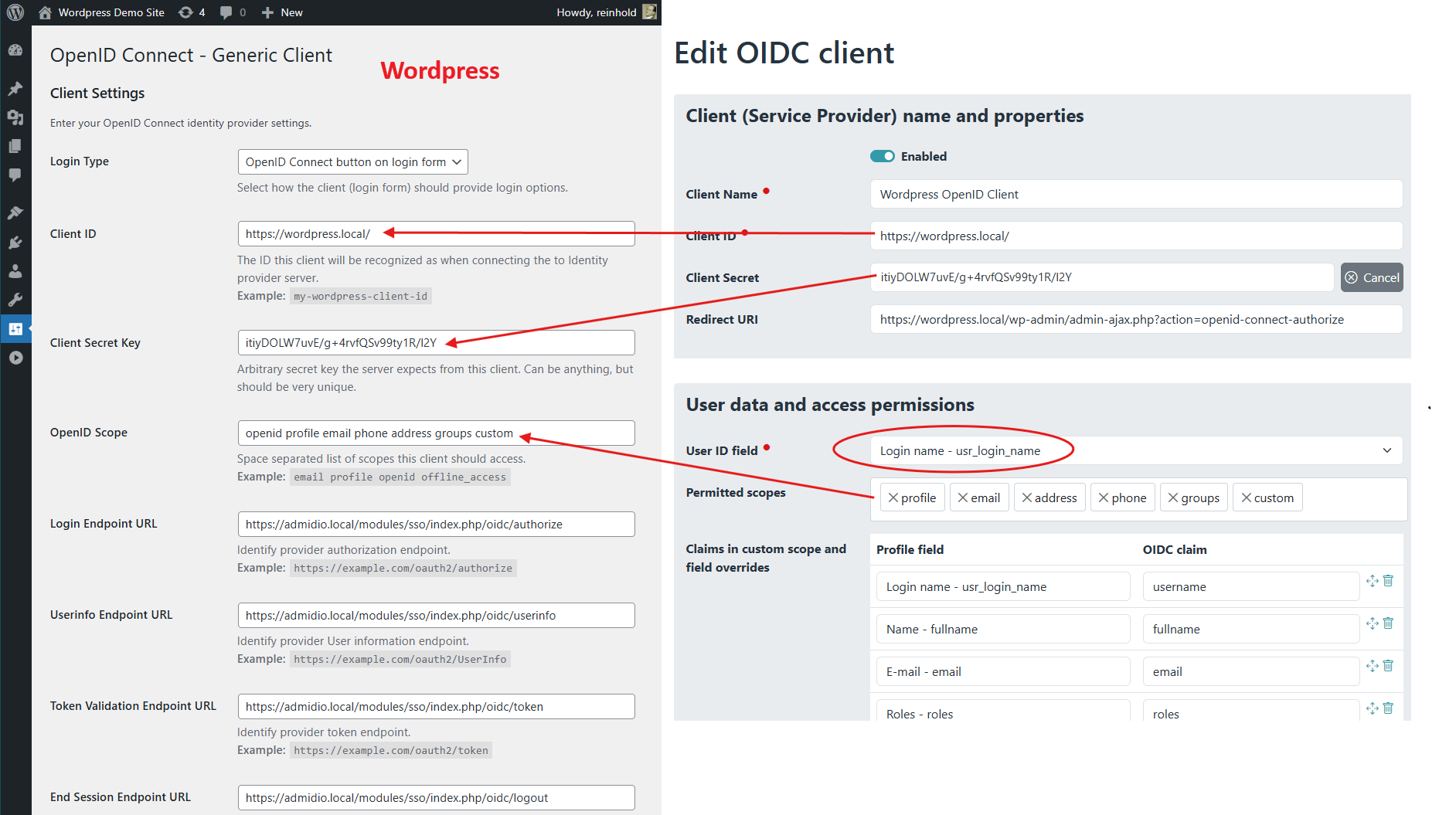 - The OpenID Connect for WP plugin does not support groups and assigning WordPress permissions based on OpenID claims. If this is required, consider Single-Sign-On via the SAML protocol. WordPress has a SAML plugin that supports permission mapping and works with Admidio.