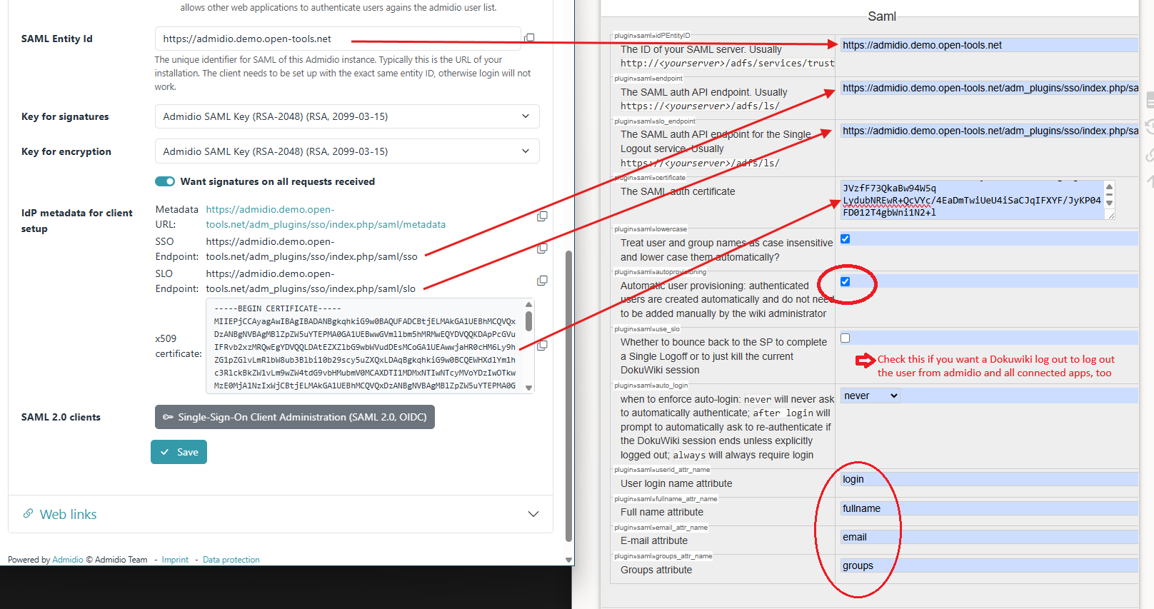 This is a typical configuration of the DokuWiki SAML extension for Admidio as an idP: