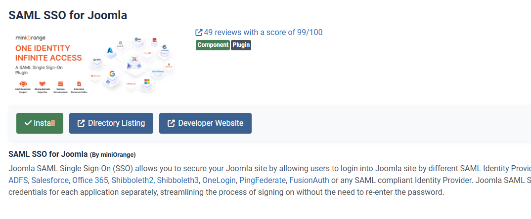 Currently, the only available SAML 2.0 extension for Joomla is “SAML SSO for Joomla” by miniOrange, which provides basic SAML in its free version, but other features like group mapping or profile fields are only available in the (quite expensive) paid version.