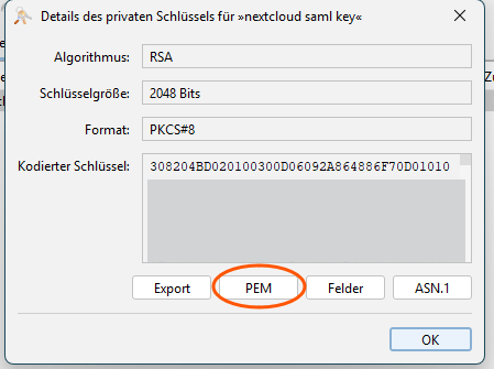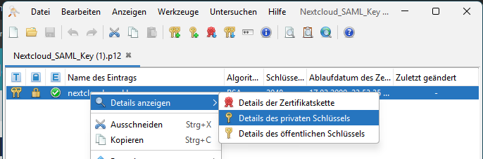 After downloading the .p12 file, Applications like KeyStore Explorer can be used to read the private key and copy the private key and the certificate in PEM format into a file and upload them into Odoo's SAML configuration. As signature algorithm choose either SHA1 or the more modern SHA256.