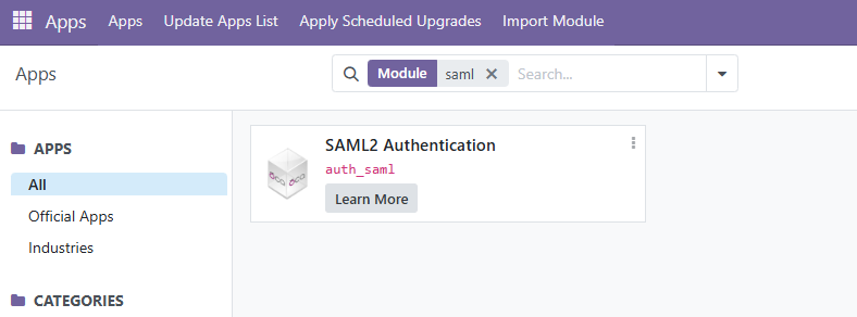 We will describe SAML login via the free "SAML2 Authentication" app. Unfortunately, that app does not auto-provision users (ie. create a new user if an Admidio user successfully logs in via SAML - the users have to be manually created in Odoo and connected to a SAML username), nor does it provide group sync (i.e. using Admidio groups to grant permission in Odoo).