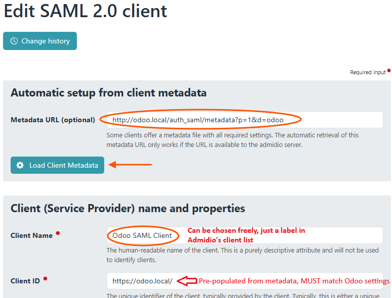 Setting up a client (SAML “Service Provider” - short SP) to use Admidio's user accounts for logging in consists of two steps. If both the IdP (Admidio in our case) and the SP (Odoo in this document) support metadata loading, the setup is very straightforward and easy. Otherwise, one has to copy URLs manually to the client, but Admidio already provides these in a single place, so this situation is not as bad, either.