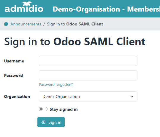 Once these basic SAML settings are done, I would recommend to set up the SP in Admidio, and do the remaining settings (transmitted fields, as well as signing/encryption requirements) in parallel in Odoo and Admidio.