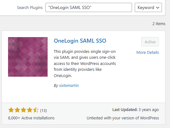 There are several SAML plugins for Wordpress, mostly non-free and quite expensive. A free SAML plugin that provides login, but also profile field and group sync is the plugin “OneLogin SAML SSO”, which can be installed directly in the plugin manager.